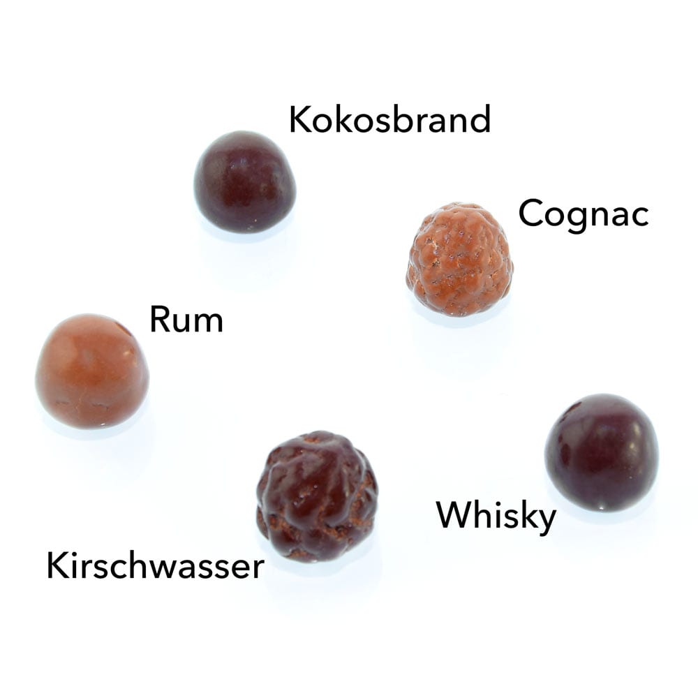 Verkehrsbezeichnung: Mit Whisky-, Rum Kokos-, Kirschwasser-, und Cognac- haltiger Füllung, flüssig gefüllt, dragiert mit Vollmilch- oder Zartbitterschokolade (Schokoladenanteil 61%).