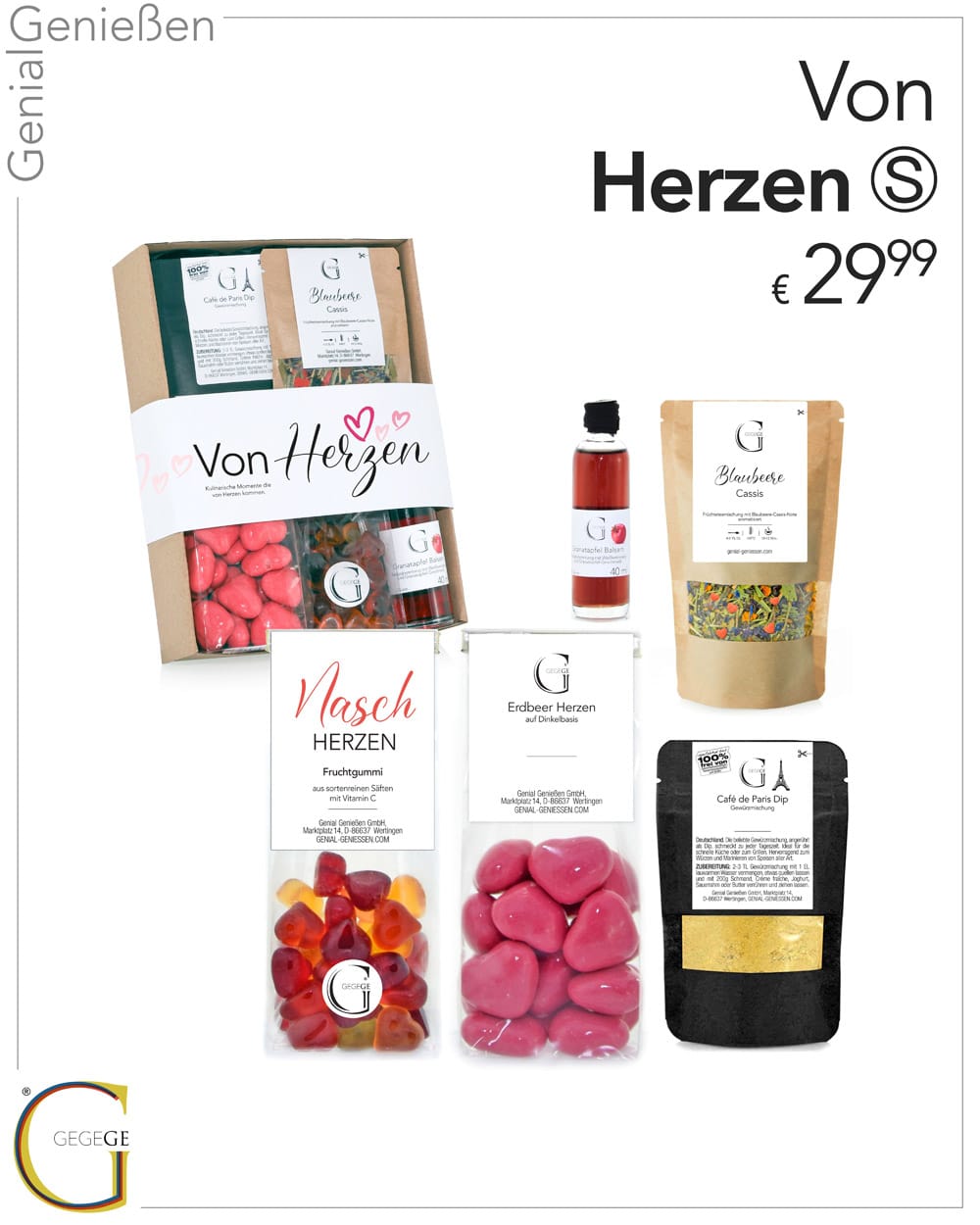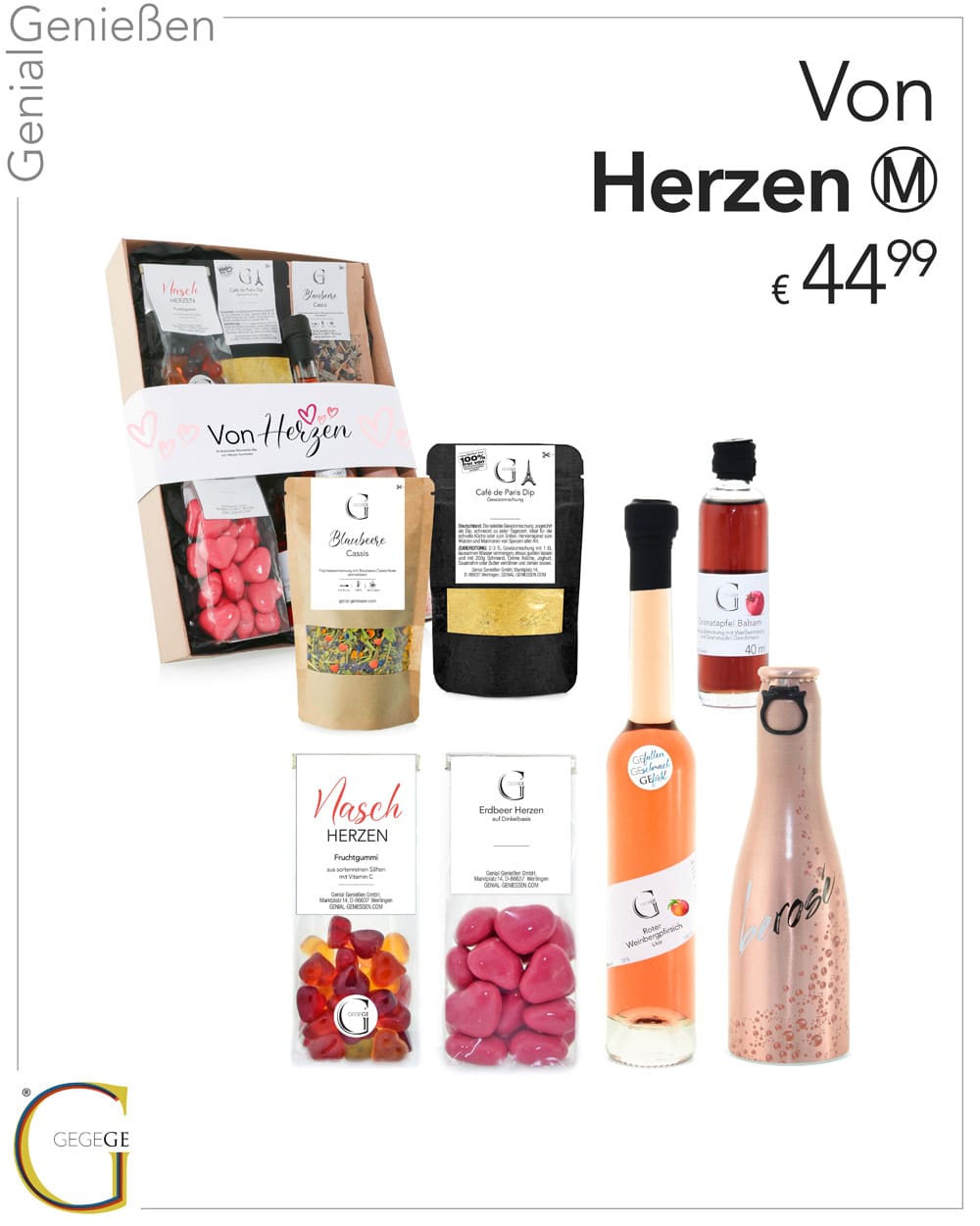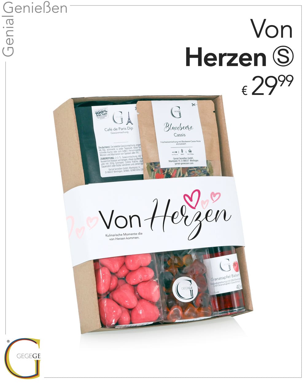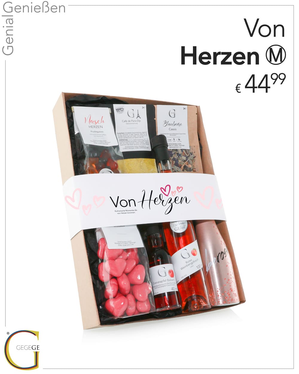 Alles liebevoll verpackt in einer hochwertigen Geschenkbox mit edler Banderole – „Von Herzen“ ist das perfekte Geschenk, um unvergessliche Momente zu teilen und das Leben zu feiern. Genial Genießen – für alle, die von Herzen schenken möchten.