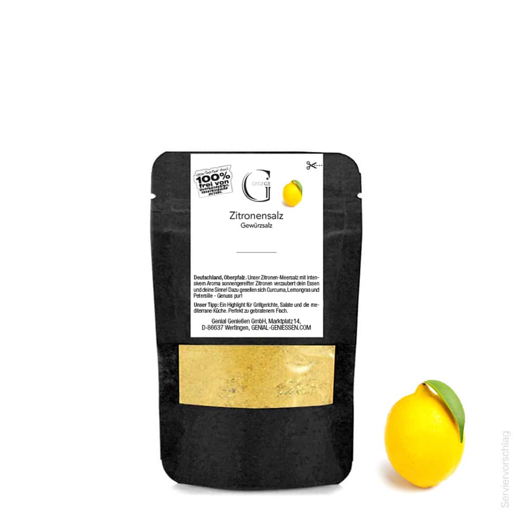 Anwendungstipps - Lieferung in 1-3 Werktagen (B2C)Herkunft: Deutschland.Zitronensalz – dieses Meersalz mit intensivem Aroma sonnengereifter Zitronen verzaubert Ihr Essen und Ihre Sinne! Dazu gesellen sich Curcuma, Lemongras und Petersilie. Genuss pur!